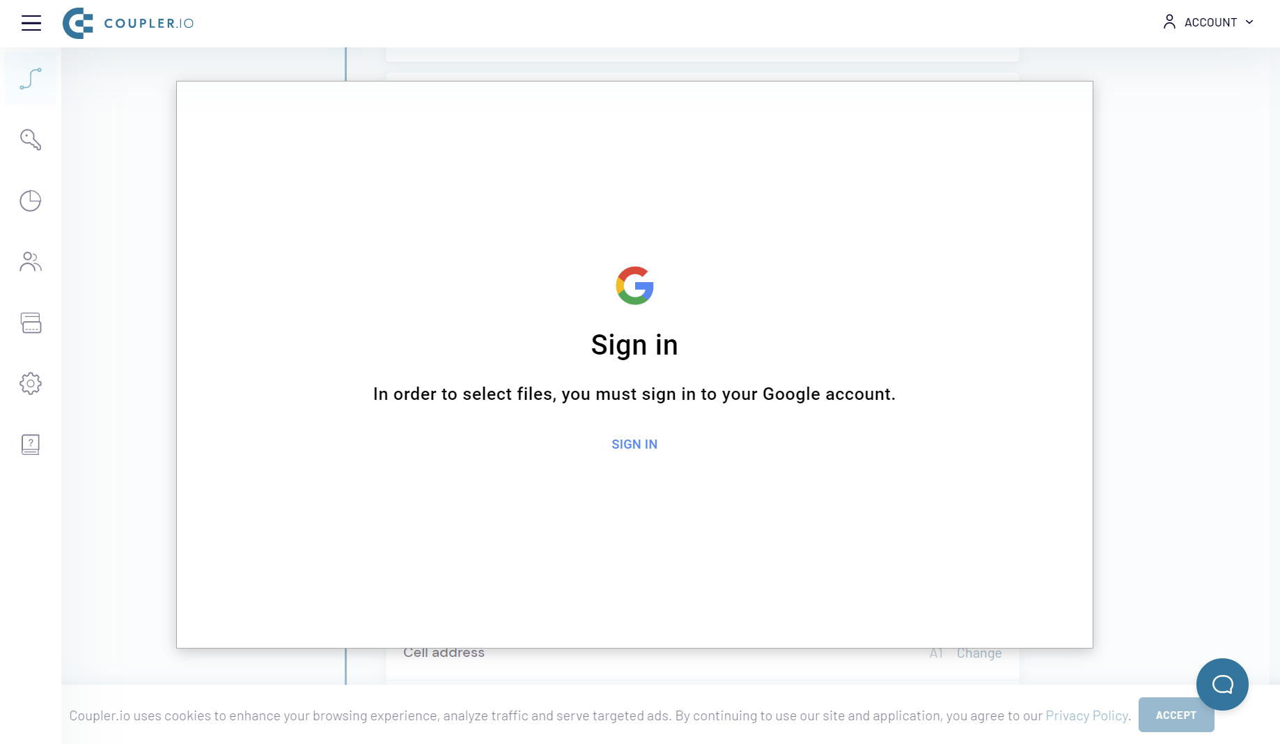 - Sign in with the Google account that you used to install Coupler.io (it is required for this account to be the first one you sign in to).