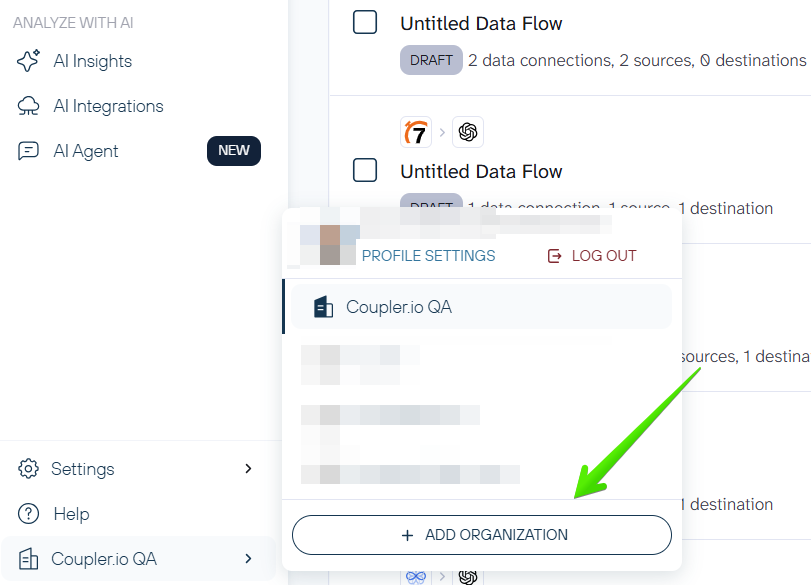 You can create multiple organizations in Coupler.io — for example, to separate billing, teams, or projects.