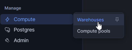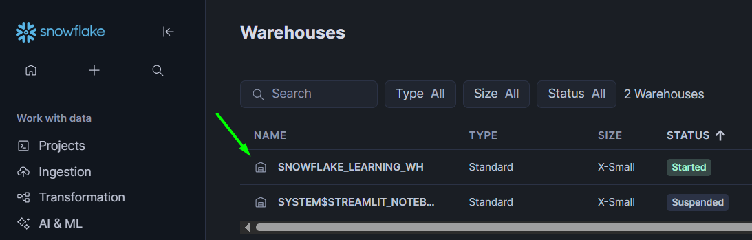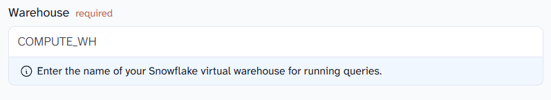 Copy name of warehouse created on step 2 or you can use already existing warehouse. To find it: navigate to Compute -> Warehouses menu -> Copy name of warehouse: