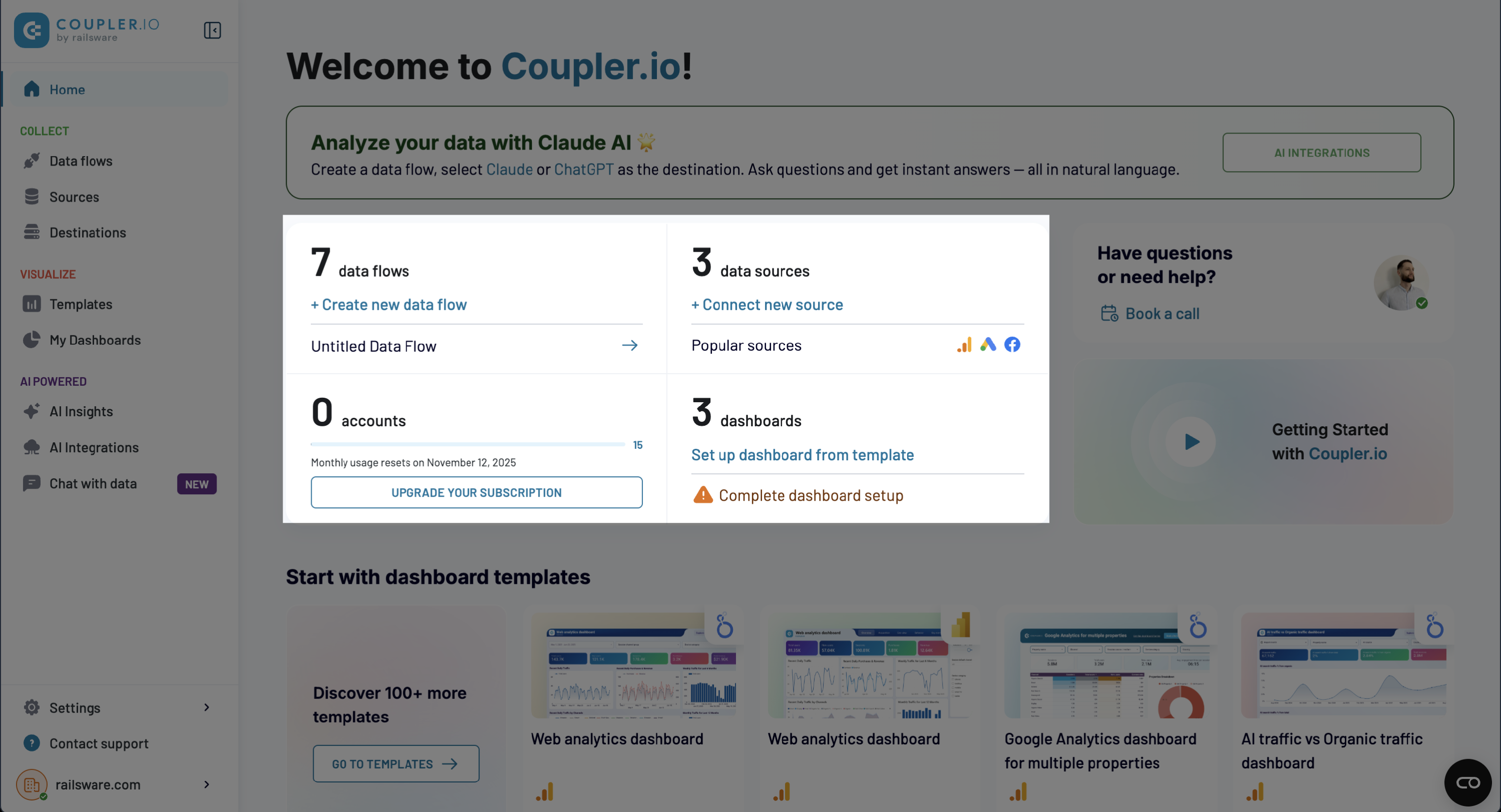 On this page, you will be able to see the progress bar with the number of accounts you currently use, the number of data flows you have, the data sources that you have connected, and the number of dashboards set up.