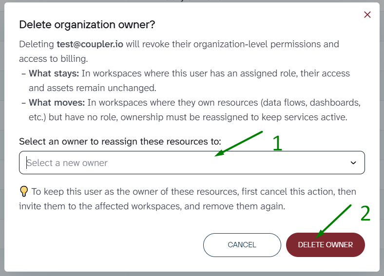 When you attempt to remove an organization owner who has no workspace-level role in one or more workspaces, you'll see a confirmation popup with a required action to select a new owner for their resources: